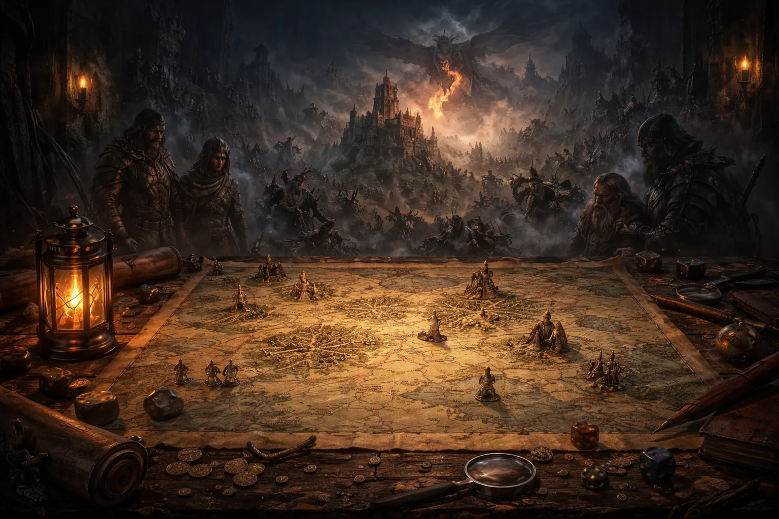 Export your calibrated map as a tiled PDF. Every grid square prints at exactly 1 physical inch at 100% scale — ready for the table.